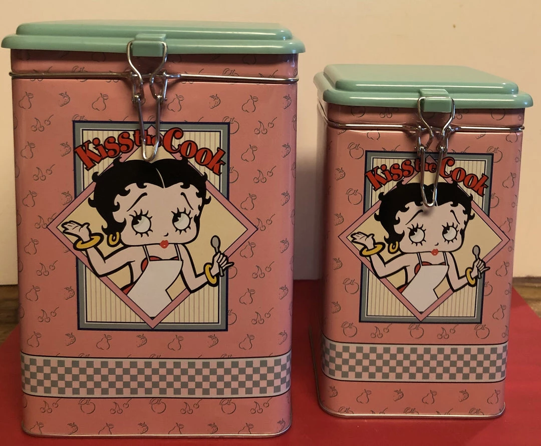 Betty Boop Kiss The Cook Canister Set (2) Tin Canisters Large 8 1/2 x 6 x 6, small 7 1/2 x 4 x 4. Part of the Kiss the Cook collection. Clip tight lids to keep contents fresh. Pink and light green with Betty on both pieces dressed in her kitchen apron with a spoon in her hand. Retired 2004