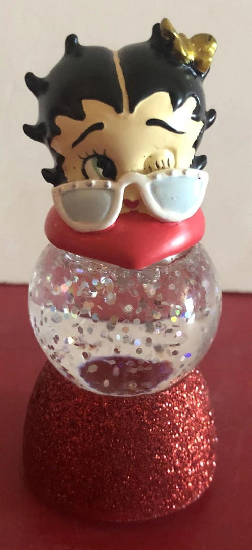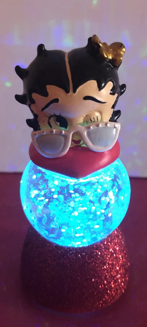 betty Boop Light Up Snowglobe has Betty’s head with a pair of sunglasses sitting on her nose. She is peeking over them with a wink. Very cute. They light up with lots of sparkles. The base is a shimmering red. A great holiday gift for cake toppper.