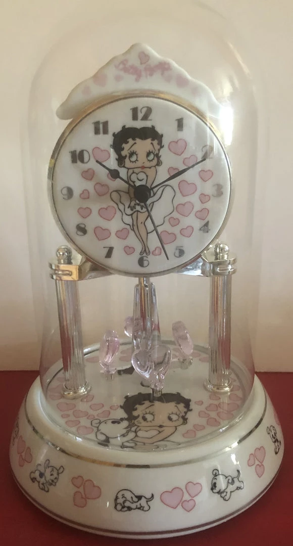 Betty Boop Pink Hearts and Pudgy Porcelain Anniversary Clock has Betty in the clock face with pink hearts all around her in a White Dress in the Marilyn pose. On the base has Betty with Pudgy and pink hearts and 4 light pink hearts that swing. Around the very bottom of the base it has Pudgy in different poses and pink hearts. Beautiful Clock. Retired in 2008 Very difficult to find.