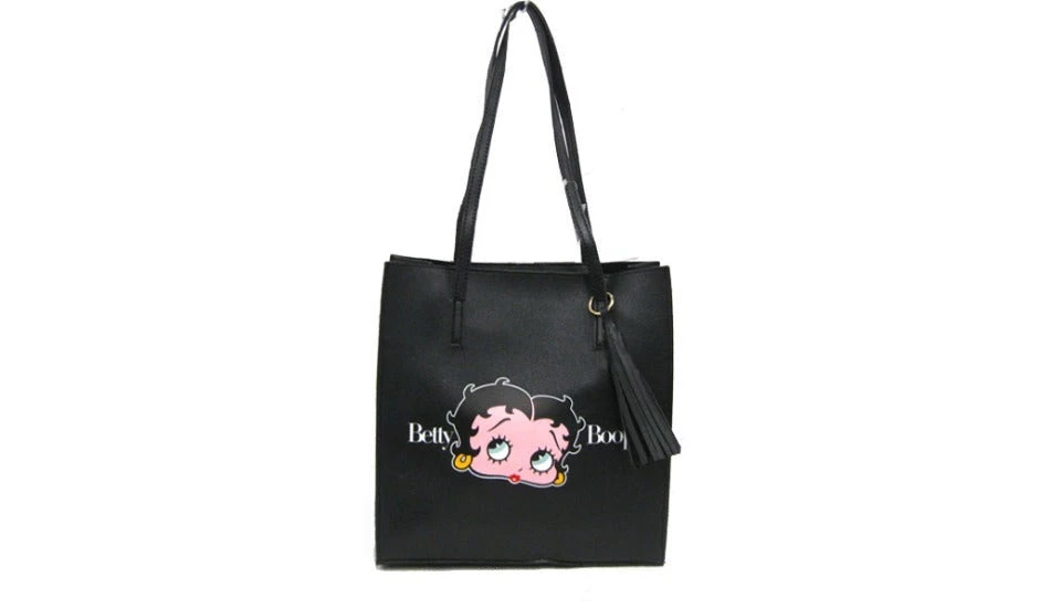 Betty Boop Red or Black Tassel Purse. This beautiful Purse is 12 x11 1/4 x 4 1/2. Has 12 inch by 1/2 inch double handles. Zipper top. Nice deep purse with beautiful tassel hanging from front side of purse with Betty’s face and the words Betty Boop.